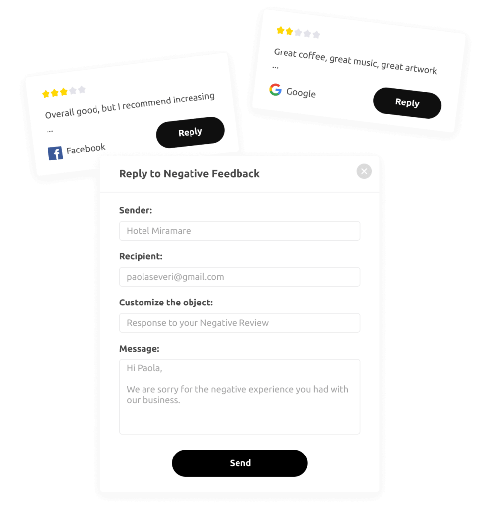A 123Ranks fornece funcionalidades robustas que permitem às empresas capturar feedback negativo e mantê-lo confidencial. Não será postado em seus perfis. Através da nossa plataforma, você pode monitorar e responder a todas as avaliações de maneira integrada, ao mesmo tempo em que aumenta seletivamente o número de avaliações positivas nas plataformas escolhidas.