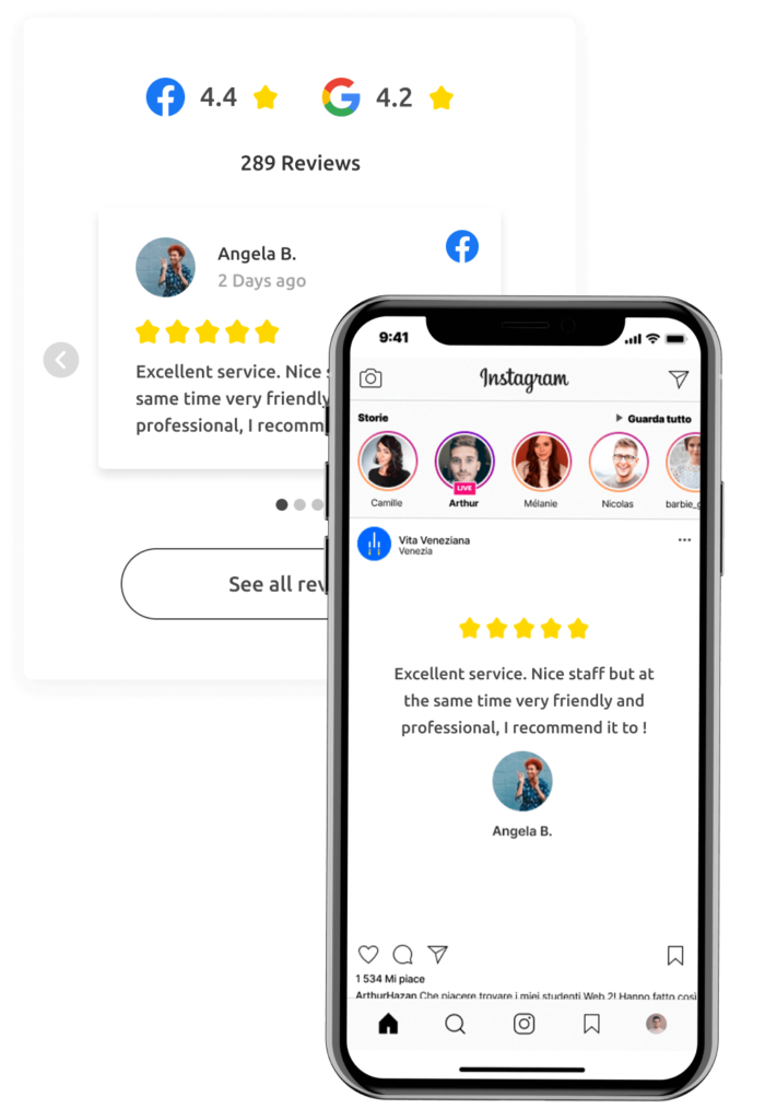 Compartilhe as suas melhores avaliações na sua página do Facebook ou Instagram através de modelos personalizáveis.